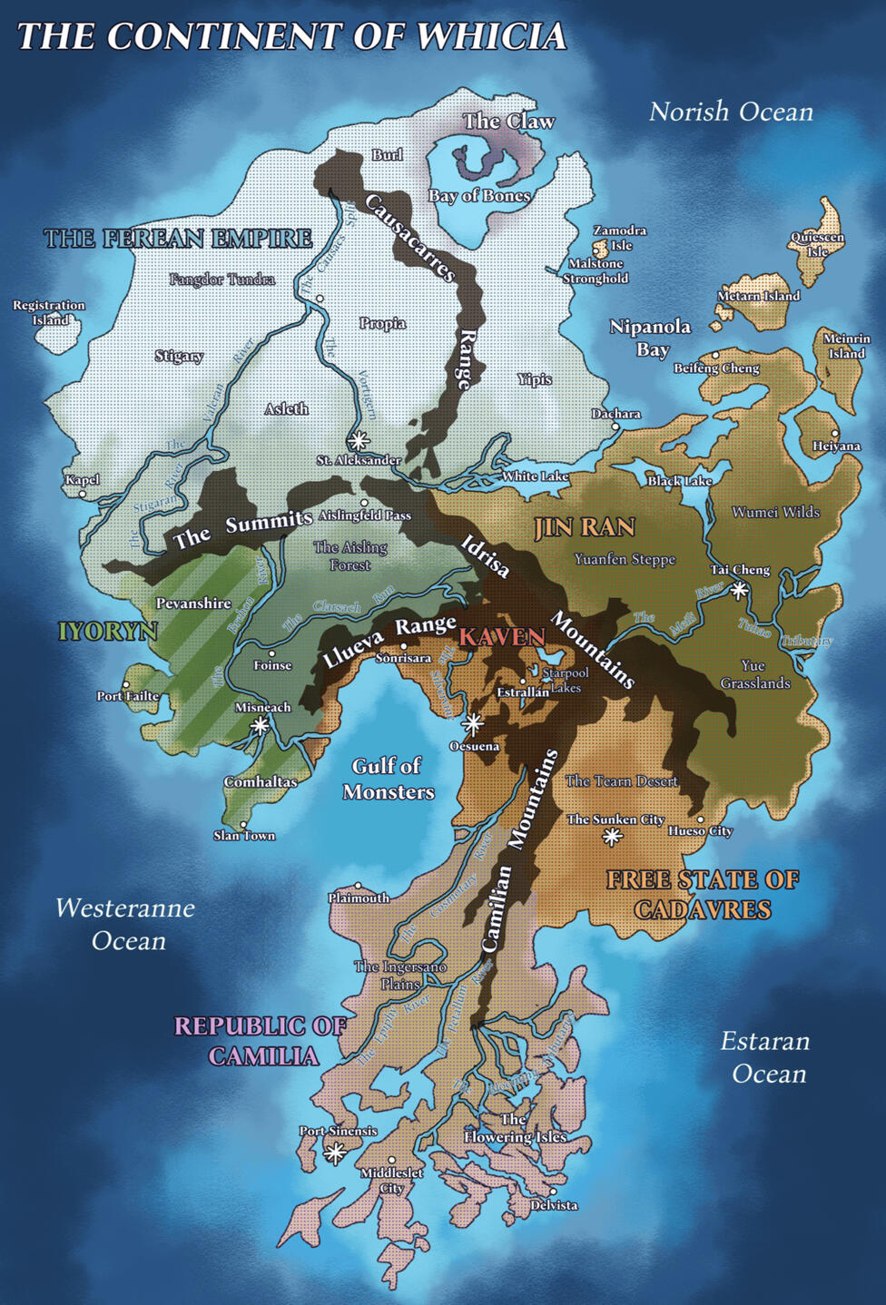With the coronation of Emperor Alexey Aramore VI, the war formally expanded into Iyoryn. It was claimed that the Cult of Oenar’s influence had spread, infecting the minds of the Iyorish people. Though Ferea claimed they intended only to attack those spreading Oenar’s dark gospel, thousands of civilians were caught in the crossfire. Rebel groups, with the support of Kaven, fought back for nine long years, working hard to purge the Ferean army. Though ultimately they were defeated, forced back into the shadows when General Nikolai Aramore took the capital city of Misneach. For the Iyorish people, The Holy War is known instead as The Devastation.